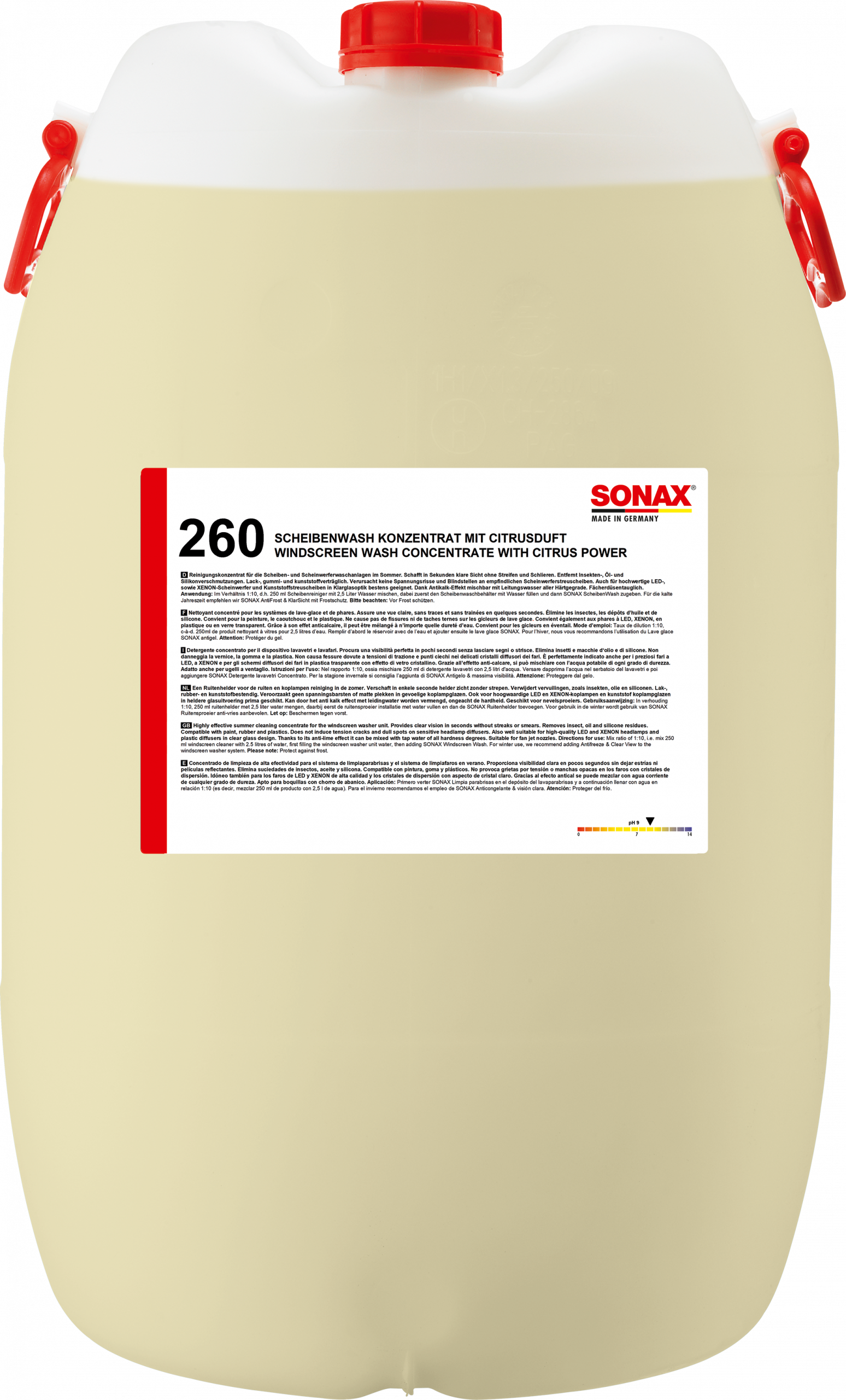 Reinigungskonzentrat für die Scheiben- und Scheinwerferwaschanlage im Sommer. Schafft in Sekunden klare Sicht ohne Streifen und Schlieren. Entfernt gefährliche Blend- und Schmierfilme von Insekten-, Öl- und Silikonverschmutzungen schnell und zuverlässig. Maximale Lack-, Gummi- und Kunststoffverträglichkeit. Verursacht keine Spannungsrisse und Blindstellen an empfindlichen Scheinwerferstreuscheiben. Für hochwertige Laser-, Matrix-LED- sowie XENON-Scheinwerfer bestens geeignet. Ideal für den Einsatz bei neuen Wischertechnologien und Fächerdüsen. Auch auf Mattlacken, folierten Fahrzeugen und empfindlichen Reparaturlacken getestet. Dank Antikalk-Effekt für die Mischung mit hartem Wasser bestens geeignet. Maximale Sicherheit dank minimaler Wischtakte – besonders in kritischen Situationen wie bei Regen, Dunkelheit und Gegenlicht. Mit frischem Citrusduft.